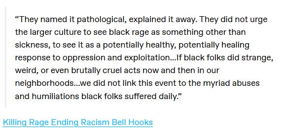 Black women’s rage is all throughout this book, but the first taste we have of it is in the first two chapters. This passage from bell hook’s Killing Rage feels particularly germane!