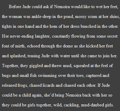 “Before Jude could ask if Nemoira would like to wet her feet, the woman was ankle-deep in the pond, mossy scum at her shins, tights in one hand and the hem of her dress bunched in the other. Her never-ending laughter, constantly flowing from some secret font of mirth, echoed through the dome as she kicked her feet and splashed, teasing Jude with water until she came to join her. Together, they giggled and threw mud, squealed at the feel of bugs and small fish swimming over their toes, captured and released frogs, chased lizards and chased each other. If Jude could be a child again, she’d bring Nemoira back with her so they could be girls together, wild, cackling, mud-daubed girls.”