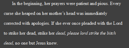 “ In the beginning, her prayers were patient and pious. Every curse she heaped on her mother’s head was immediately corrected with apologies. If she ever once pleaded with the Lord to strike her dead, strike her dead, please lord strike the bitch dead, no one but Jesus knew.”
