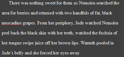 “There was nothing sweet for them so Nemoira searched the area for berries and returned with two handfuls of fat, black muscadine grapes. From her periphery, Jude watched Nemoira peel back the black skin with her teeth, watched the fuchsia of her tongue swipe juice off her brown lips. Warmth pooled in Jude’s belly and she forced her eyes away.”