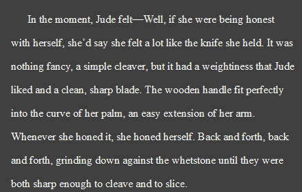 “In the moment, Jude felt—Well, if she were being honest with herself, she’d say she felt a lot like the knife she held. It was nothing fancy, a simple cleaver, but it had a weightiness that Jude liked and a clean, sharp blade. The wooden handle fit perfectly into the curve of her palm, an easy extension of her arm. Whenever she honed it, she honed herself. Back and forth, back and forth, grinding down against the whetstone until they were both sharp enough to cleave and to slice.”