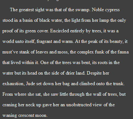 “The greatest sight was that of the swamp. Noble cypress stood in a basin of black water, the light from her lamp the only proof of its green cover. Encircled entirely by trees, it was a world unto itself, fragrant and warm. At the peak of its beauty, it must’ve stank of leaves and moss, the complex funk of the fauna that lived within it. One of the trees was bent, its roots in the water but its head on the side of drier land. Despite her exhaustion, Jude set down her bag and climbed onto the trunk. From where she sat, she saw little through the wall of trees, but craning her neck up gave her an unobstructed view of the waning crescent moon.”
